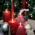 La bougie pilier avec rainures et paillettes est un incontournable pour créer une atmosphère intime et festive.