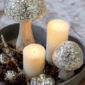Réalisé en bois de manguier naturel, son pied sobre et chaleureux contraste avec le chapeau recouvert d’un éclatant revêtement en verre mosaïque argentée. La finition brillante apporte un jeu de lumière féérique, parfait pour les tables de fête, les rebords de cheminée ou en composition décorative d’hiver.
