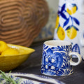 Son fond blanc naturel est rehaussé de motifs bleus appliqués à la main, avec de légères variations qui rendent chaque tasse authentique et unique. Le motif floral ou graphique évoque les carreaux céramiques méditerranéens et apporte une touche d’évasion à votre vaisselle.